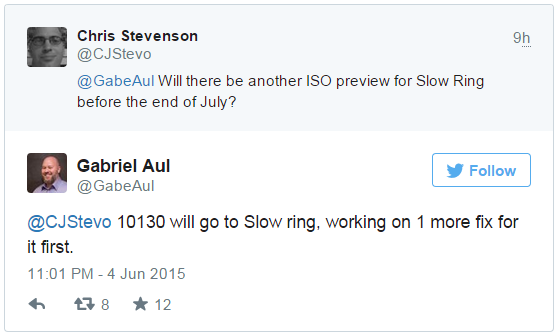Windows Insider项目负责人Gabe Aul又为我们带来了新消息:再完成一个修复补丁后,Build 10130版就会发布至“Slow Ring”用户。