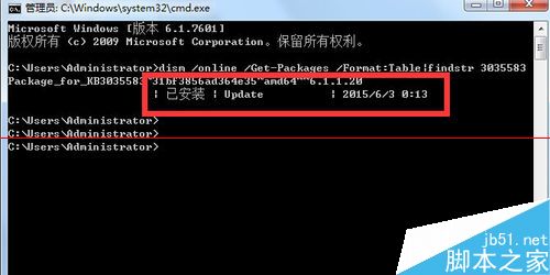 2命令提示符会显示你是否已安装KB3035583补丁,如上图红色部分标注。如果没有安装,请转到控制面板–Windows更新中检查更新