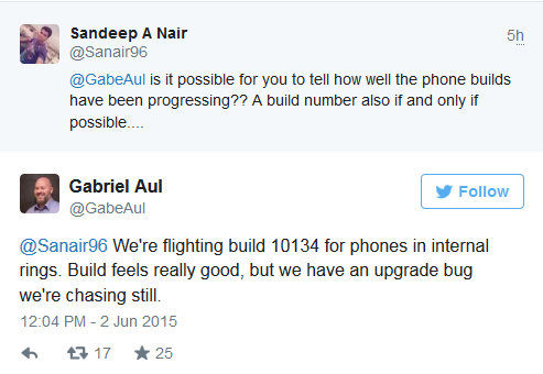 不过,Insiders项目负责人Gabriel Aul在Twitter回复用户称,团队内部正在测试build 10134,并表示该版本用起来非常棒。这样的答复想必是用户非常期待的,但是用户想要用上build 10134估计还要等上时日,因为只有等到团队确认该版本能够解决早期测试者现面临的问题之后才会对外推送。