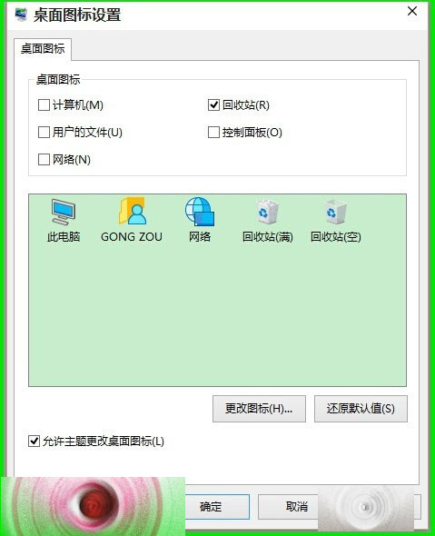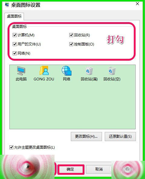 在桌面图标设置的对话框的桌面图标栏里,我们在要放到桌面的图标前,左键点击复选框打勾,再点击:应用 - 确定;