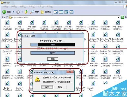 10、将之前选中的字体文件,直接拖到这个文件夹即可。注意,如果已安装过字体,Windows系统会有所提示。