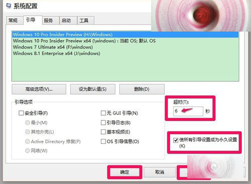 3、在引导标签下,我们可以看到右侧有个超时(T),在这个框里可以更改计算机的开机启动时间,这里是6秒,也可以更改为3秒,并点击使所有引导设置成为永久设置(K),再点击:应用 - 确定,重启计算机。