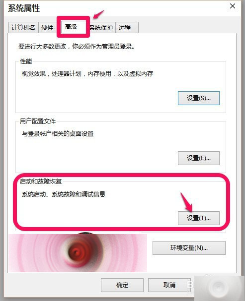 3、在系统属性对话框,我们点击启动和故障恢复栏的设置;