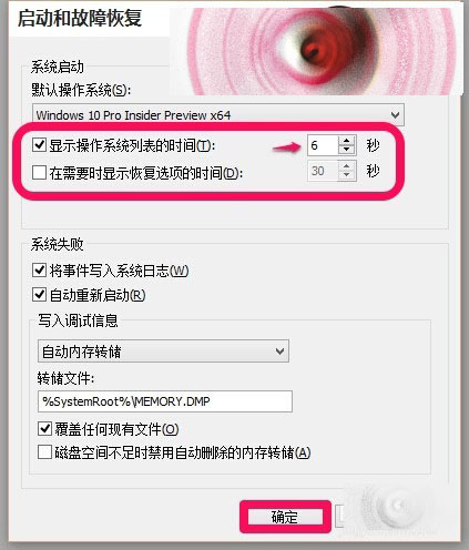 4、在启动和故障恢复对话框,显示操作系统列表时间(T)现在为6秒(因为我的计算机是多系统,故设置为6秒),可以更改为3秒,也可以去掉显示操作系统列表时间(T)复选框的勾,时间为0秒,再点击:确定。