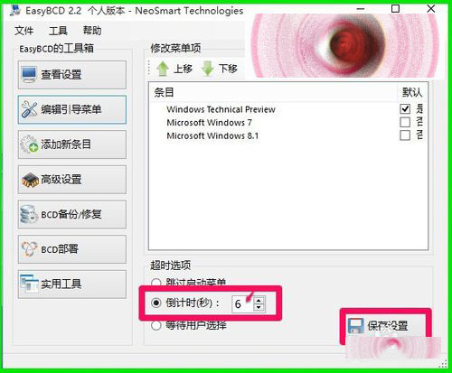 1、在EasyBCD.exe软件中设置:倒计时(秒)现在为6秒,可更改为3秒,再点击:保存设置。
