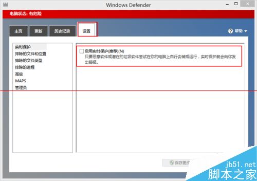 4、Win8下微软默认杀毒MSE和Windows Defender合二为一了,当我们打开EXE,压缩包比较多的文件夹,它就会一直扫描,解决办法:快捷键Win+X →控制面板 →Windows Defender →设置 →实施保护 → 去掉勾 和 管理员 →启用 Windows Defender →去掉勾。
