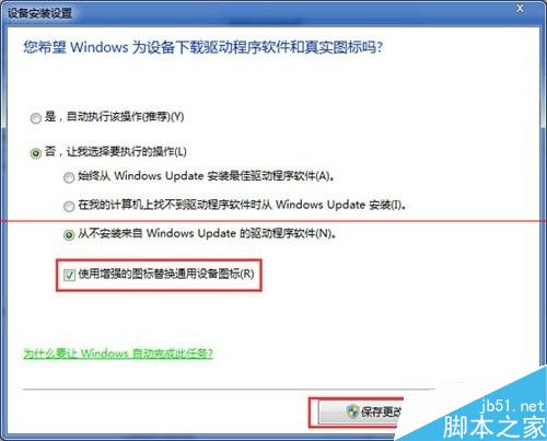 5、选择完了之后,别忘记了按一下保存更改按钮哦。经过上面简单的操作设置,Win7就不会自动安装驱动了,想要安装哪一种最新驱动都得看用户的意向了,相信本篇教程能为你带来一定帮助。