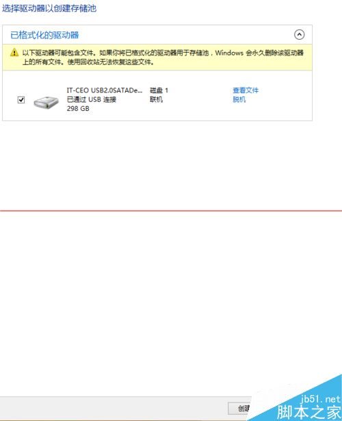 3、如果电脑此时只有win8系统所在的一块硬盘,下一步不会识别到任何信息,如果连接上更多的硬盘或者USB接口的U盘/移动硬盘,这里就可以识别到。勾选想要加入存储池的硬盘,然后点击右下角的”创建池”。
