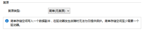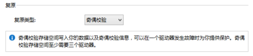 注意:每种类型对于硬盘数量和所占用的大小都是有要求的。如果当前加入”存储池”中的硬盘数量达不到复原类型的最低要求,是没法完成创建的。(如图所示,当只有一块硬盘加入”存储池”时,双向/三向/奇偶校验都没法创建,只有简单可以创建)