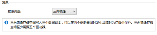 4、上一步是将用于备份的容量加到一个大的”池”中,如果想发挥备份的功能,还需要将“池”中的容量继续划分成一个或者若干个”存储空间”。这一步就是建立不同复原类型的存储空间。默认创建的是双向镜像,另外还有简单/三向镜像/奇偶校验几项类型可以选择。