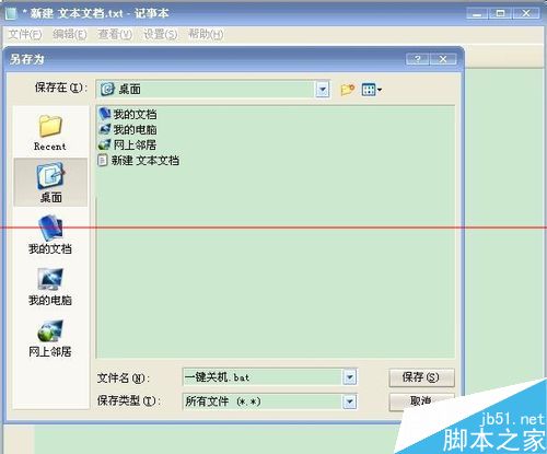 4、点击“另存为”,在文件名窗口中将名称改为“一键关机.bat”,然后保存。桌面上就创建了一个叫“一键关机”的批处理文件。打开它,效果就等于正常关机程序,“开始”—>“关闭计算机”—>“关闭”,这三个步骤。