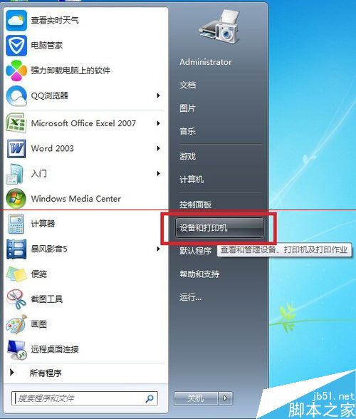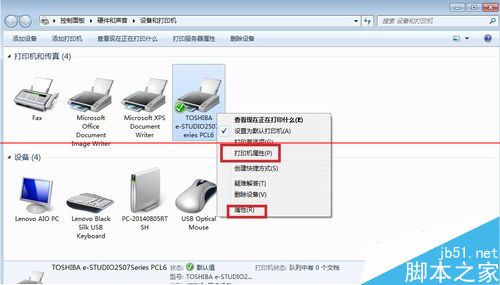2、这时候会出现显示你所使用电脑上连接的所有设备和打印机,找到你电脑连接的打印机,右击,选择“打印机属性”(或者“属性”,根据打印机不同,略有差别)