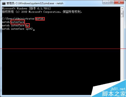 2、在命令提示符中依次输入"netsh"--->"interface"--->"ip",并依次回车。