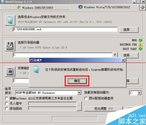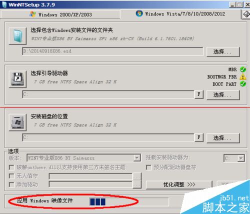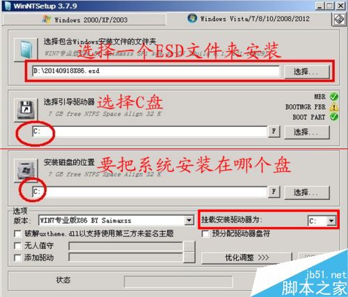 1、打开winntsetup,在"选择包含windows安装文件的文件夹"这里,点击"选择"找到你的ESD安装文件."选择引导驱动器"默认为C盘,"安装磁盘的位置"是指你要把系统安装到哪个盘,比如C盘,或者D盘等.下面的"选项"一栏有一个"版本",是指的所要安装的系统的版本,如果ESD文件中有多个版本的话,可以在这里进行选择."挂载安装驱动器"默认为C盘.点击"开始安装"按钮,准备安装系统.