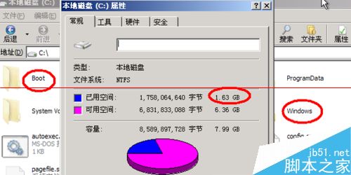 4、解压缩完成后,我们看看C盘中已经有了boot,windows等文件夹,解压出来的文件大小为1.63GB.
