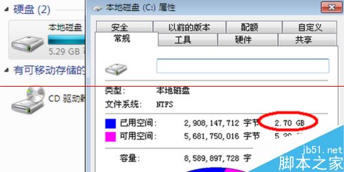 7、我们看看安装完成后C盘已使用2.7GB的空间,而ESD文件只有316M,可见这个压缩率还是很高的.如果是GHO文件最少也得要700M-800M吧或者更多.