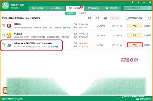 在软媒软件管家窗口的Windows10技术预览版中文版10102(X64)后左键点击:升级;