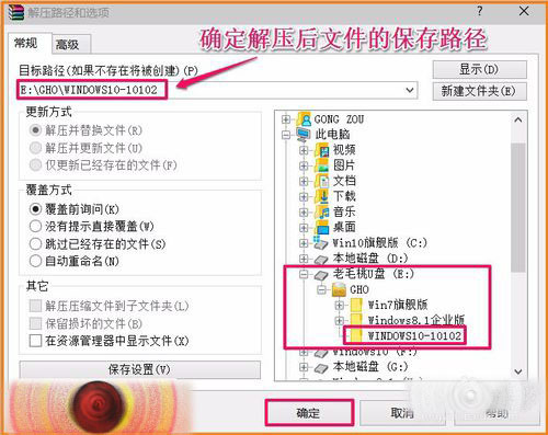 在解压路径和选项窗口,我们确定解压后文件的保存路径为:E:GHOWindows10-10102(已经制作好U盘启动器的U盘),再点击:确定;