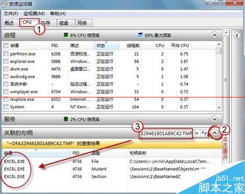 2、在win7 64位系统xitongcheng.com/win7/64/“资源监视器”对话框中,切换到“CPU”选项卡,点击“关联的句柄”栏右侧的小箭头,将其展开;