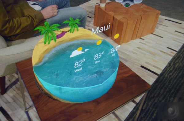 只要你戴着眼镜,各种应用窗口就可以跟着你走,沙发茶几上有个相当帅气的天气显示界面。