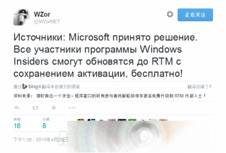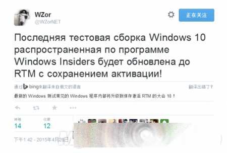 随后,他又在另一条推文中表示,保持安装最新Win10预览版的体验成员,在升级到RTM版之后系统将保持激活状态,似乎对自己的爆料非常有信心。