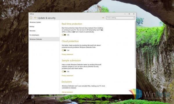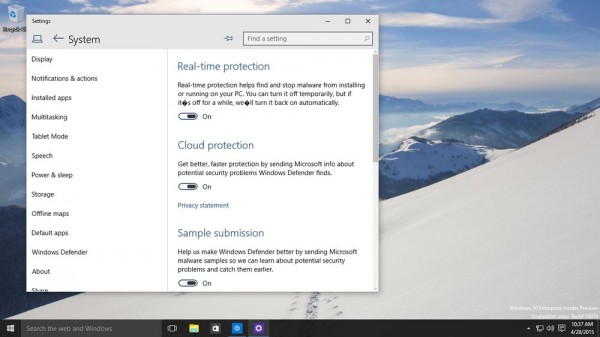 此前你需要通过设置应用的系统类目下访问Windows Defender设置,但是在10074版本中,你可以同时在两个类目下访问该选项,显然微软在测试哪个位置更加合理优秀。现在如果你想要调整Windows Defender设置,那么你只需要点击设置应用的更新和安全类目就能访问,也许这只是在线调试(OCD),但是这改变无疑是不错的决定。