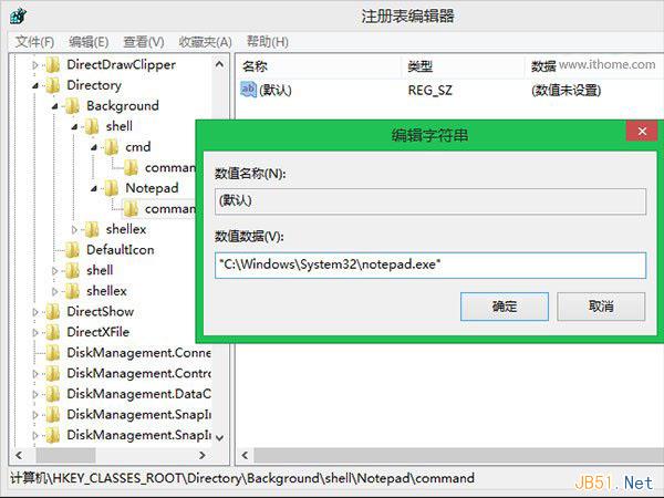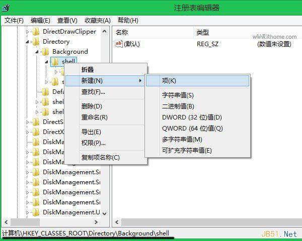 3、依次定位至HKEY_CLASSES_ROOTDirectoryBackgroundshell路径,在shell旗下新建“项”,例如记事本“NotePad”、“QQ”、截图工具“SnippingTool”,Win8/Win8.1专属滑动关机“SlideToShutDown”等项目。