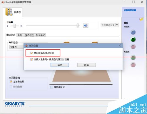7、单击设置文件夹后,把“禁用前面板插孔检测”勾上并确定