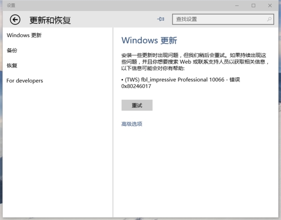 当用户试图更新安装Build 10066时,系统会给出错误提示,故障描述代码为“0x80246017”。