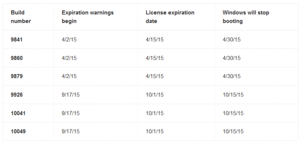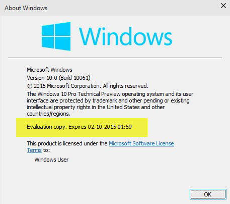 根据上面显示的截至日期清单,最新的Windows 10技术预览版(10061)最终的截至日期为2015年10月2日,不过在停止启动之前用户还有两周的时间。届时系统会弹出这样的通知: