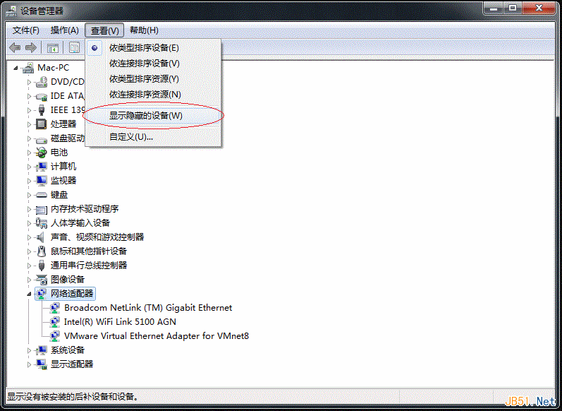 接着,笔者上网找了个驱动卸载的小工具,可是也没能解决问题。笔者断定,很可能该设备是被系统隐藏起来了。果然不出所料,在【设备管理器】的【查看】菜单下有一个【显示隐藏的设备】的选项,如下图: