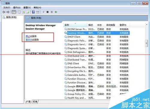 2、打开win7系统xitongcheng.com/win7/“服务”窗口,接着在服务窗口上找到Desktop Window Manager Session Manager服务,选择“停止此服务”,停止Desktop Window Manager Session Manager服务;