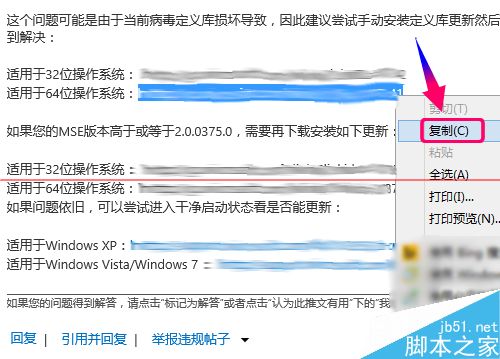 3、然后你会在第一个搜索结果里找到解决方案,打开进入该文章,造成此原因是系统自带病毒库异常造成,因此我们只需要按照上面的提示,复制对应系统位数的连接,下载病毒库到本地更新