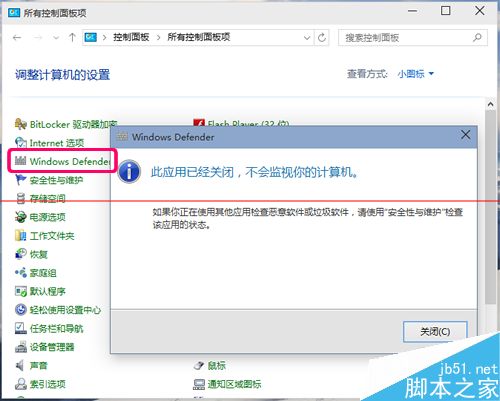 6、病毒库下载完成后,直接打开执行病毒库更新操作,更新完成后,打开控制面板,点击进入Windows Defender选择关闭