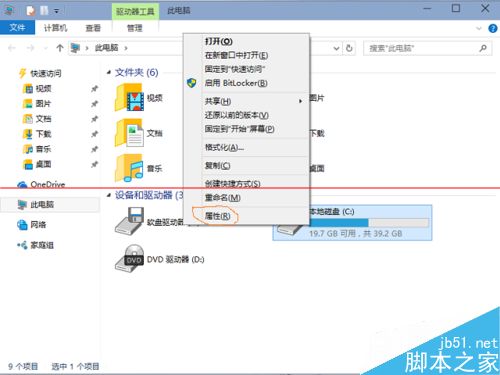 3、在我的电脑中,右键点击该目录所在盘符,如小编是在C盘,在弹出菜单中选择最下一行<属性>