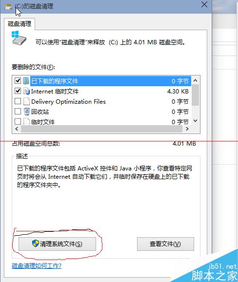 5、系统会自动扫描并收集可以清除的空间,但系统缺省不会清除系统文件,需要在弹出菜单中选择<清理系统文件>,如下图红圈所示