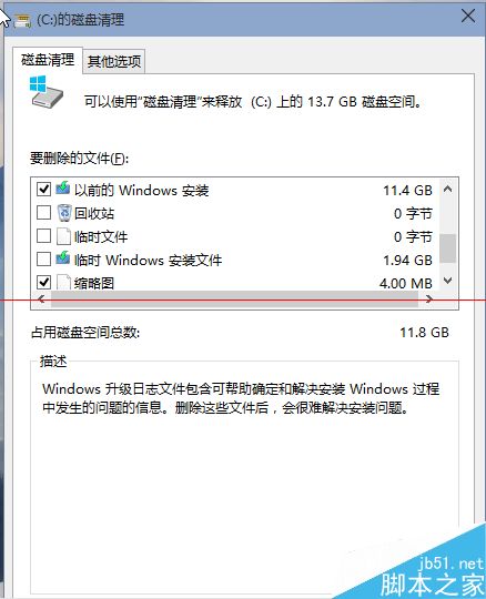 6、系统会再次计算空间,这次就会计算老的系统文件了,选中<以前安装的windows>复选框,有11G,如果想再清理,可以把<临时的windows安装文件>也选中,也有接近2G,然后点击确定。
