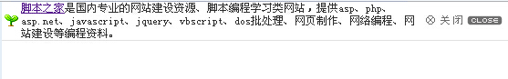 <html><head><title>网站页首可关闭广告条</title><style type="text/css"><!--body { margin: 0px;padding: 0px;text-align: center;}TD {FONT-SIZE: 12px; COLOR: #333;}#topadv {BORDER-BOTTOM: #e2e2e2 1px solid;}--></style></head><body><SCRIPT> function floatadv(){document.getElementById("topadv").style.display="none"; }</SCRIPT><DIV id=topadv><table width="100%" border="0" cellspacing="0" cellpadding="0"> <tr> <td width="4%" height="30" align="center"><img src="images/kids.gif" width="15" height="14"></td> <td width="82%"><a href="http://www.jb51.net/">脚本之家</a>是国内专业的网站建设资源、脚本编程学习类网站,提供asp、php、asp.net、javascript、jquery、vbscript、dos批处理、网页制作、网络编程、网站建设等编程资料。</td> <td width="14%" align="right"><a style="CURSOR: hand" onClick=floatadv()><imgsrc="images/close.gif" width=84 height=11 hspace="6" border=0></a></td> </tr></table></DIV></body></html>希望本文所述对大家的javascript程序设计有所帮助。
