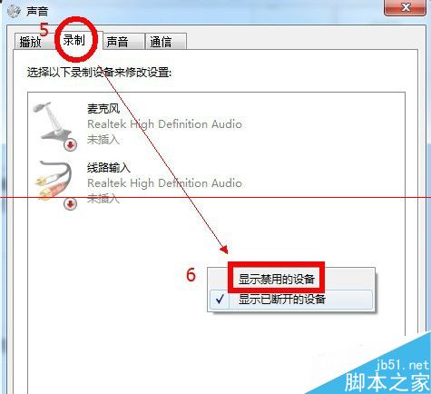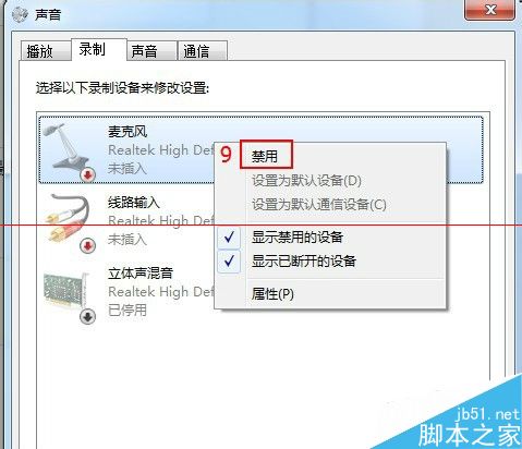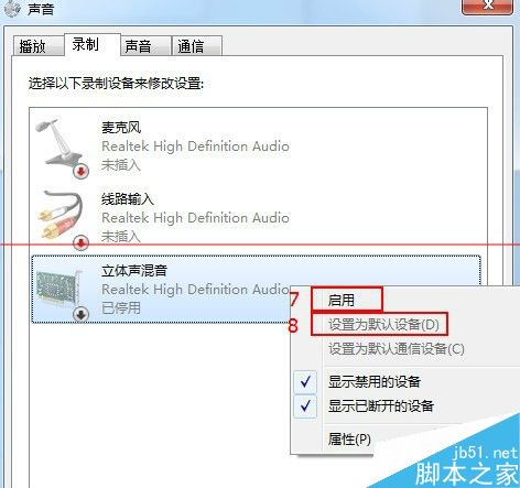 2、选择【录制】,在窗口空白处,点击右键,选中【显示已禁用的设备】,此时多出一个【立体声混音】,选中,右键选择【启用】,同时将【立体声混音】设为默认设备,另外,为了防止混音,我们可以将【麦克风】--【右键】--【禁用】。如图:
