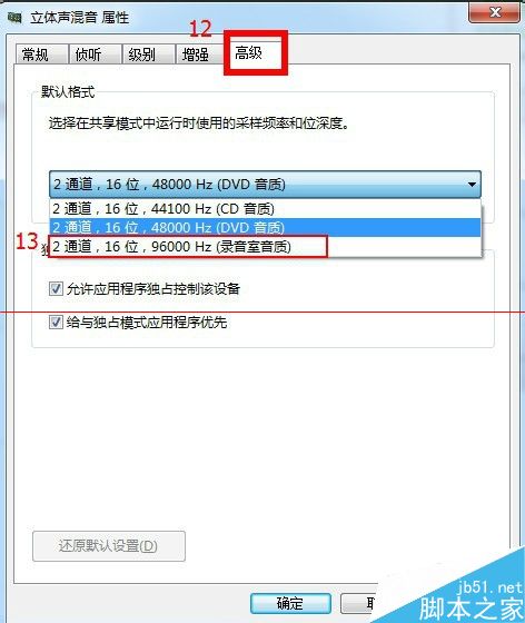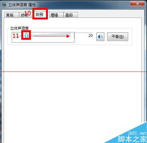 3、双击【立体声混音】--【级别】,将下面的音条拖到最大。选择【高级】,选择【录音室质量】。如图: