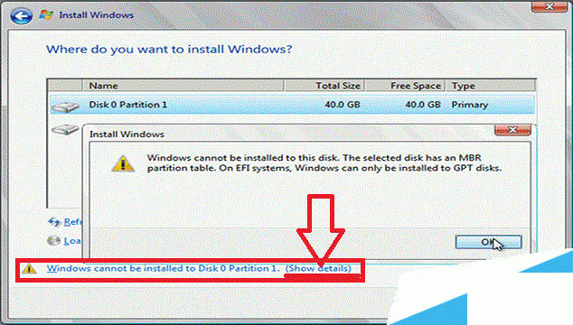 问题1:Windows cannot be installed to this disk. the selected disk has an MBR partition table. On EFI system, Windows can only be installed to GPT disks.