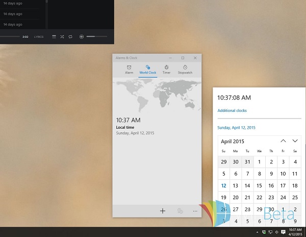 在早前的报道中,我们曾介绍过Windows 10 Build 10056带来的几处细节变化,其中就包括新的日历和时钟样式。现在,当你在系统托盘区点击日期时间的时候,就会弹出最近时间和一个迷你日历。如果进一步点击“附加时钟”(Additional Clocks),就会启动“闹钟和时钟”(Alarm & Clock)应用,以便于用户查看世界时钟,或者设置闹钟、定时器、或计时器。