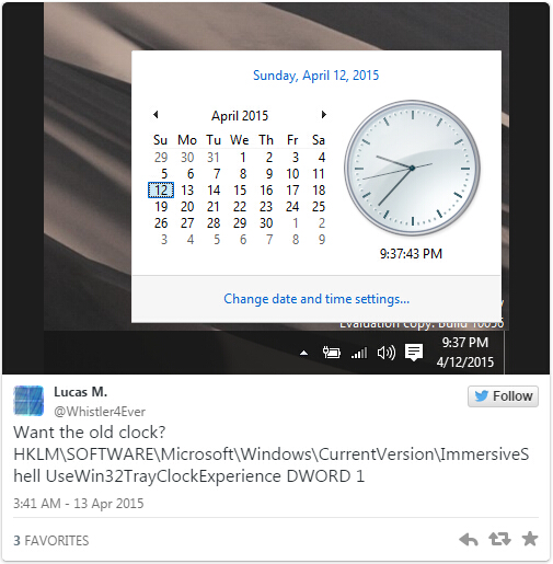 想要将Windows 10 Build 10056的系统托盘时钟恢复成旧版界面的话,你需要一些注册表技巧。当然,由于编辑注册表有一定的风险,所以我们并不建议经验不丰富的人们使用此技能。