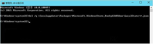 然后,输入 del /q %localappdata%PackagesMicrosoft.WindowsStore_8wekyb3d8bbweLocalState*.json 回车即可。