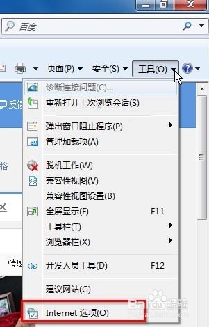 1、打开IE浏览器,点击菜单栏上面的“工具-Internet选项”项;