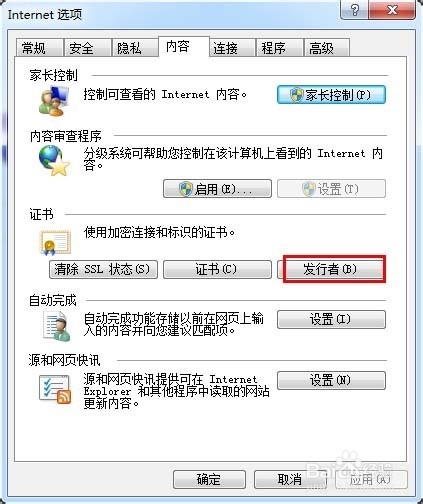 2、在打开的Internet选项窗口中,切换到“内容”标签页,然后在下方证书栏下点击“发行者”按钮;