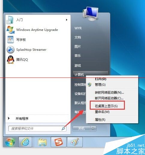 2、右击“计算机”——————“在桌面上显示”