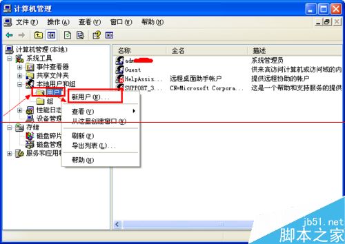 3、点开“用户”,在“用户”上点击你的鼠标右键点击“新用户”,来创建一个将来用来隐藏的用户。