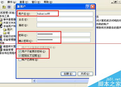 4、增加一个名为“hahaxiao88”的新用户,在“用户名(U)”一行中输入将来隐藏的用户名,在“密码”与“确认密码”中输入你给隐藏用户设置的密码。勾选“用户名不能更改密码”和“密码永不过期”这两个选项。确定以上后,点击“创建”按钮。