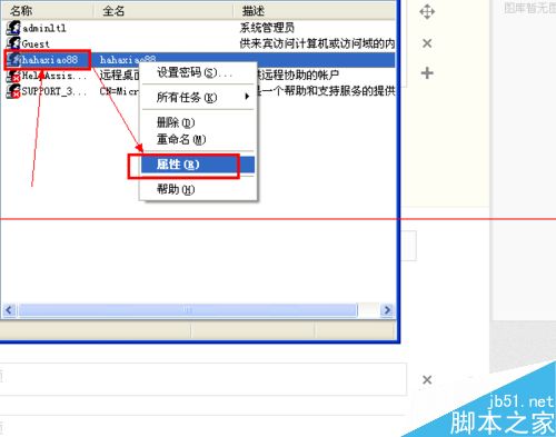 5、进入hahaxiao88用户的属性面板,创建一个用户成功后,我们关闭创建用户的窗口。然后在新创建的那个用户名上点击你的鼠标右键---->属性。